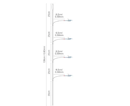 Deze paternosters van Spro zijn supermakkelijk in het gebruik. Je bindt de lijn aan je hoofdlijn, prikt je aas op de vlijmscherpe haken en je kan gaan vissen. De onderlijn is handgebonden uit stevig fluorocarbon, wat je lijn nagenoeg onzichtbaar maakt onder water. De kleurige veren op de zijlijnen bieden je aas extra aantrekkelijk aan en trekken snel de aandacht van de vis. De afhouders zorgen ervoor dat je aas niet in je lijn draait. Je kan deze onderlijnen gebruiken bij het vissen vanuit een boot of vanaf de kant. Ideaal voor de visserij op makreel.